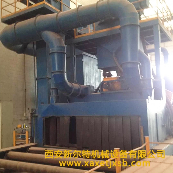 河南通过式抛丸清理机,清理过程中由电气控制的可调速输送辊道将钢结构件或钢材送进清理机室体内抛射区,其周身各面受到来自不同坐标方位的强力密集弹丸打击与磨擦,使之其上的氧化皮、锈层及其污物迅速脱落,钢材表面就获得一定粗糙度的光洁表面,在清理室外两边进出口辊道装卸工件。落入钢材上面的弹丸与锈尘经吹扫装置吹扫,撒落下来的丸尘混合物由回收螺旋输送到室体漏斗、纵横向螺旋输送机汇集于提升机下部,再提升到机器上部的分离器里,分离后的纯净弹丸落入分离器料斗中内,供抛丸循环使用。抛丸清理中产生尘埃,由抽风管送向除尘系统,净化处理后的净气排放到大气中,颗粒状尘埃被捕捉收集。